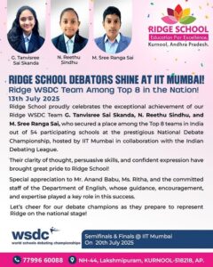 We are thrilled to announce that our exceptional Ridge WSDC Team — G. Tanvisree Sai Skanda, N. Reethu Sindhu, and M. Sree Ranga Sai — has secured a spot among the Top 8 teams in India at the National Debate Championship hosted by IIT Mumbai in collaboration with the Indian Debating League!