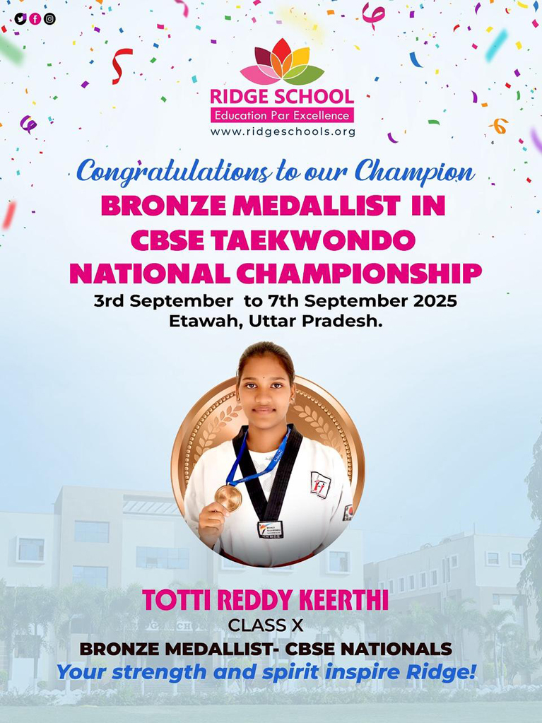 We are thrilled to celebrate the outstanding achievement of our student TOTTI REDDY KEERTHI of Grade 10 who secured the Bronze Medal at the CBSE National Taekwondo Championship. Competing against some of the finest athletes from across the country, this remarkable accomplishment is a testament to the student’s dedication, discipline, and perseverance. This achievement not only brings pride to Ridge school but also inspires fellow students to pursue excellence with determination and hard work. From early training sessions to standing on the National podium – this journey was powered by passion, perseverance, and the support of Parents and Coach alike!
