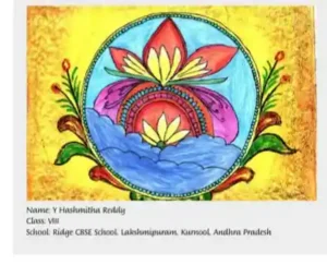 This refined mandala by Y. Hashmitha Reddy of Class VIII is published in The Hindu In School newspaper on 11th December showcases a luminous lotus at the centre, symbolising purity, growth, and inner harmony within a tranquil blue sphere . Framed by fresh green leaves and a rich golden backdrop, the artwork beautifully blends traditional Indian aesthetics with contemporary finesse, reflecting both artistic maturity and cultural sensitivity .