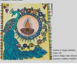 K. Lasya Varshini of Class VIII demonstrated her creativity with a vibrant artwork featuring an intricately designed peacock and a glowing diya. Published in The Hindu Young World on November 6, 2025, her piece beautifully captures cultural richness, symbolizing grace, knowledge, and positivity, and highlights her artistic talent.