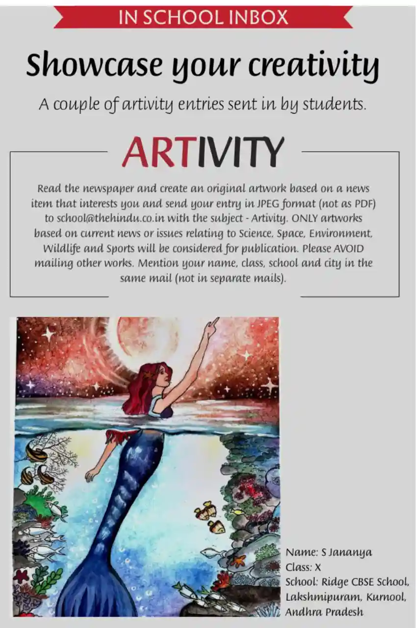 S Jananya of Class X has had her stunning mermaid artwork featured on 24th November at the Artivity section of The Hindu – In School. Her composition weaves together a vivid night sky, a glowing moon, and a richly detailed underwater world to emphasize both the beauty and vulnerability of marine life. Through expressive colour, layered textures, and intricate sea creatures, Jananya demonstrates remarkable imagination and control of mixed media, reflecting the strong grounding in visual arts and creative thinking nurtured.