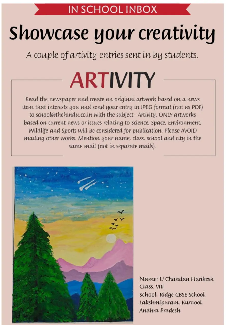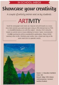 The landscape artwork created by Chandan Harikesh of Class 8 was featured in The Hindu Young World on November 4th, exemplifying youthful artistry and imagination. This striking composition encapsulates the awe of the natural world, with a spectacular sky fading smoothly from deep azure to gold, vivid emerald trees, regal violet mountains, and striking celestial flourishes. Chandan’s masterful application of colour gradients and skilled brushwork infuse the scene with serenity and vibrancy, evoking both tranquillity and adventure.