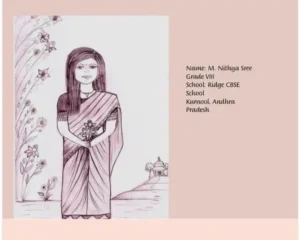 This elegant sketch by M. Nithya Sree, a talented student of Grade 8 published on 25th October in the THE HINDU Inschool newspaper beautifully captures simplicity, tradition, and poise. Her illustration of a young girl holding flowers—set against a backdrop of delicate floral detailing and a serene temple path—reflects both artistic sensitivity and careful craftsmanship.