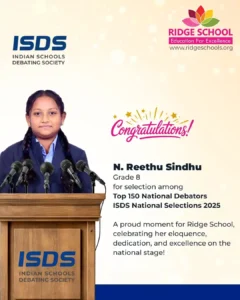 Ridge School proudly celebrates N. Reethu Sindhu of Grade 8 for earning a place among the Top 150 National Debators in the ISDS National Selections 2025. Her eloquence, sharp reasoning, and confident delivery have distinguished her on this esteemed platform.
