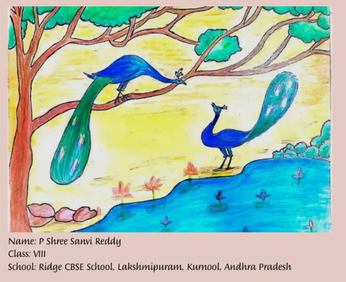 This striking artwork by P. Shree Sanvi Reddy of Class 8 C, featured on 14th October in The Hindu In School, beautifully captures the tranquility of nature. The composition depicts two majestic peacocks—the national bird of India—amid a lush, verdant landscape. One peacock is perched gracefully on a tree branch, while the other stands serenely beside a pond adorned with delicate water lilies. The vibrant palette and intricate detailing reflect the young artist’s keen eye for beauty, creativity, and artistic finesse.
