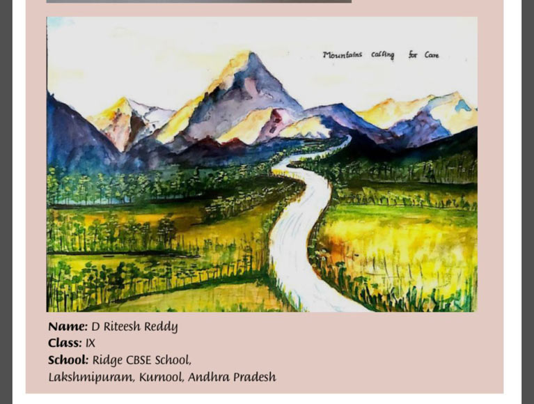 D Riteesh Reddy, Class IX student has created “Mountains Calling for Care,” a breathtaking watercolor painting that captures the serene beauty of mountains, winding roads, and verdant fields. Through his art, Riteesh conveys a timely call for environmental stewardship, urging us to protect nature’s wonders. The school celebrates this young prodigy’s creativity and commitment to pressing global themes.