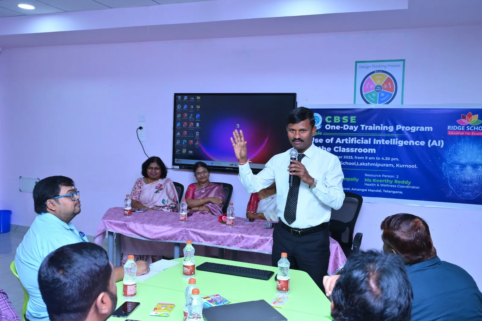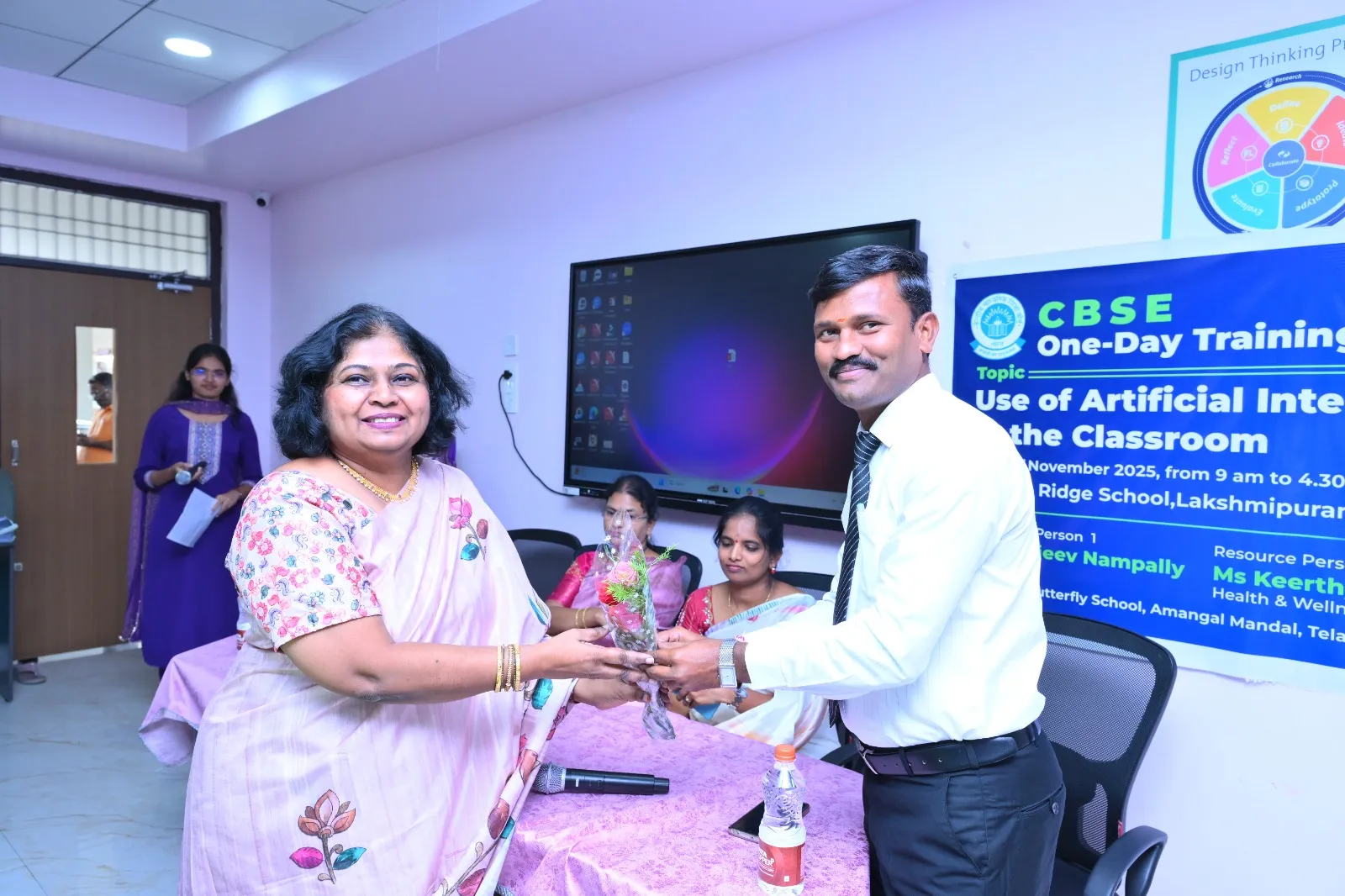 Ridge School proudly hosted a CBSE One-Day Training Program on the “Use of Artificial Intelligence (AI) in the Classroom” on 22nd November 2025. The program, led by distinguished experts Dr. Sanjeev Nampally and Ms. Keerthy Reddy from Fortune Butterfly School, provided teachers with practical knowledge and hands-on strategies to integrate AI into everyday learning.